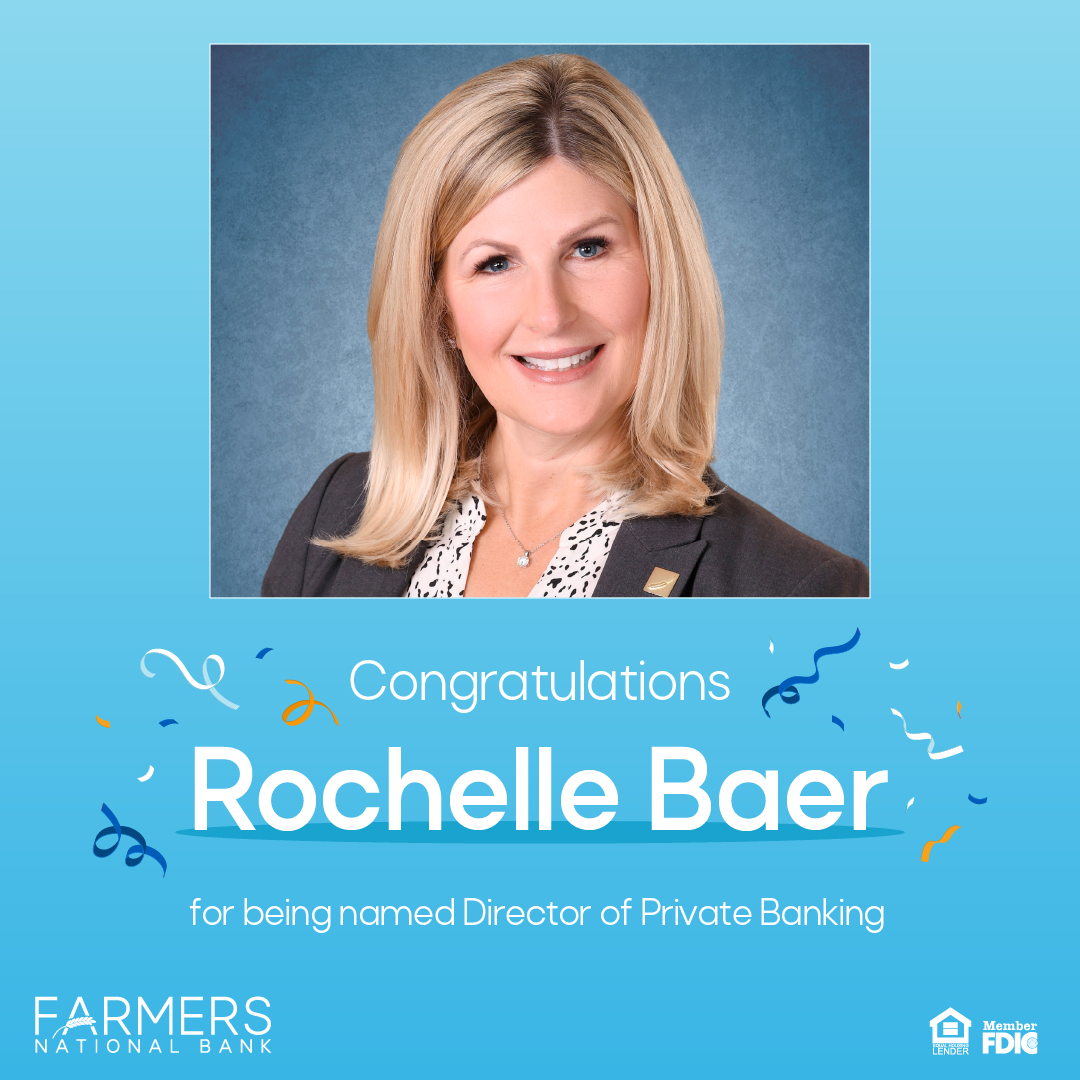 Farmers National Bank is pleased to announce the appointment of Rochelle Baer to the role of Director of Private Banking. This is a newly created role within the organization and is a direct result of the continued growth and success of the Private Banking division of Farmers.