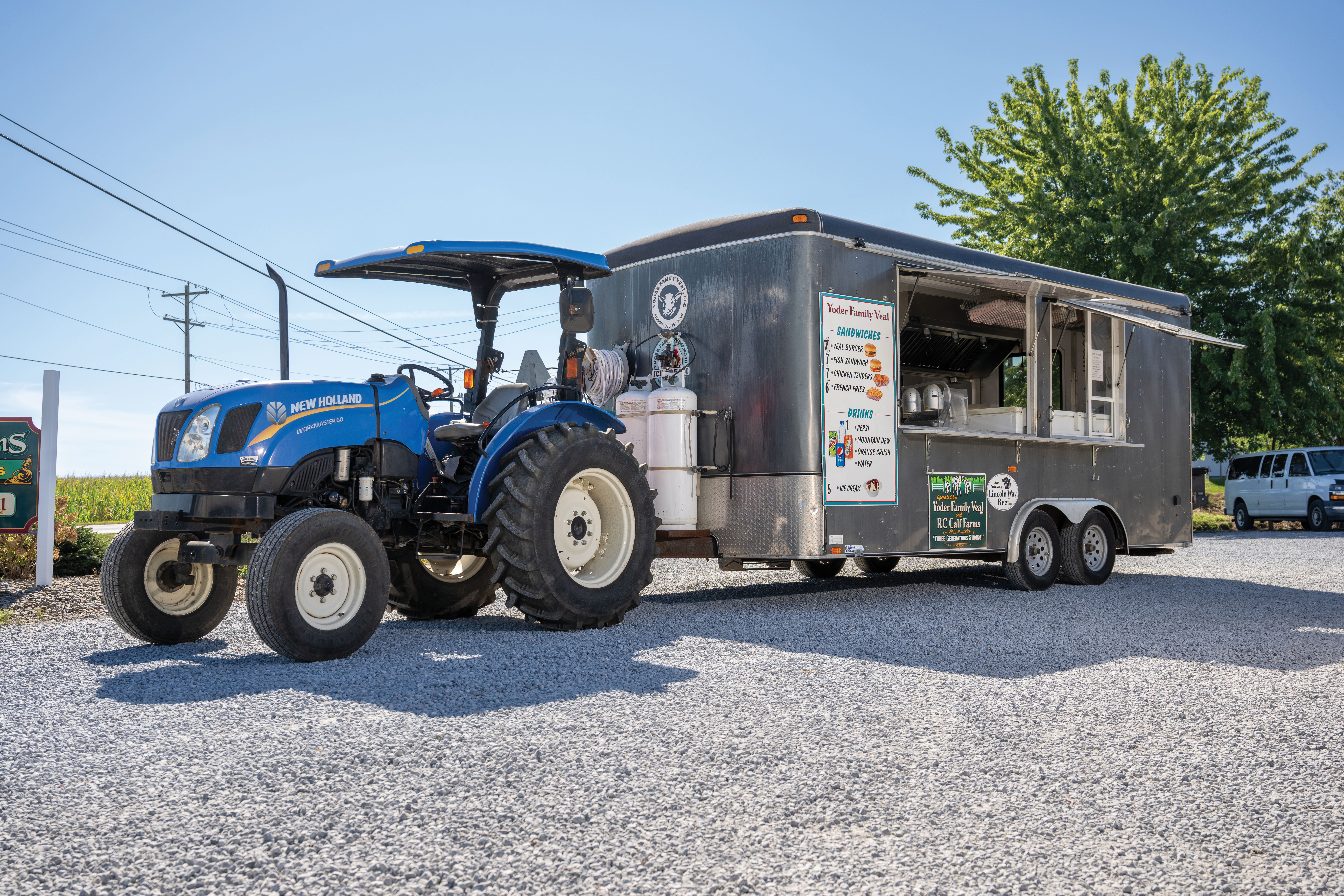 From calves to cattle to cream, ice cream specifically—just one of the items available from Yoder Family Veal, courtesy of its food trailers. The menu selection includes veal burgers, fish sandwiches, chicken tenders, onion rings, French fries, cold drinks and of course, homemade ice cream: vanilla, chocolate and raspberry.